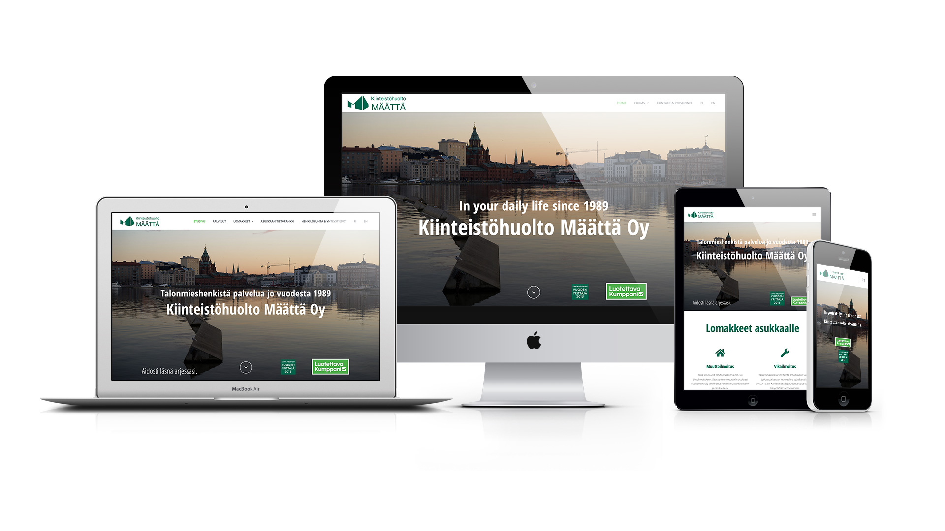 Kiinteistöhuolto Määttä Oy tarjoaa kiinteistönhoitopalveluita helsingin kantakaupungin alueella. Yrityksen verkkosivut ovat kokeneet Grisaillen käsissä jo monta vaihetta. Viimeisimmässä uudistuksessa sivustosta tehtiin kaksikielinen jotta se palvelisi